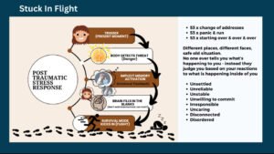 In my Reconnect & Regulate program, I use a diagram called “Stuck in Flight” to help people visualise what happens inside the body when trauma is reactivated: