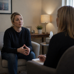 Female talking with psychologist during session